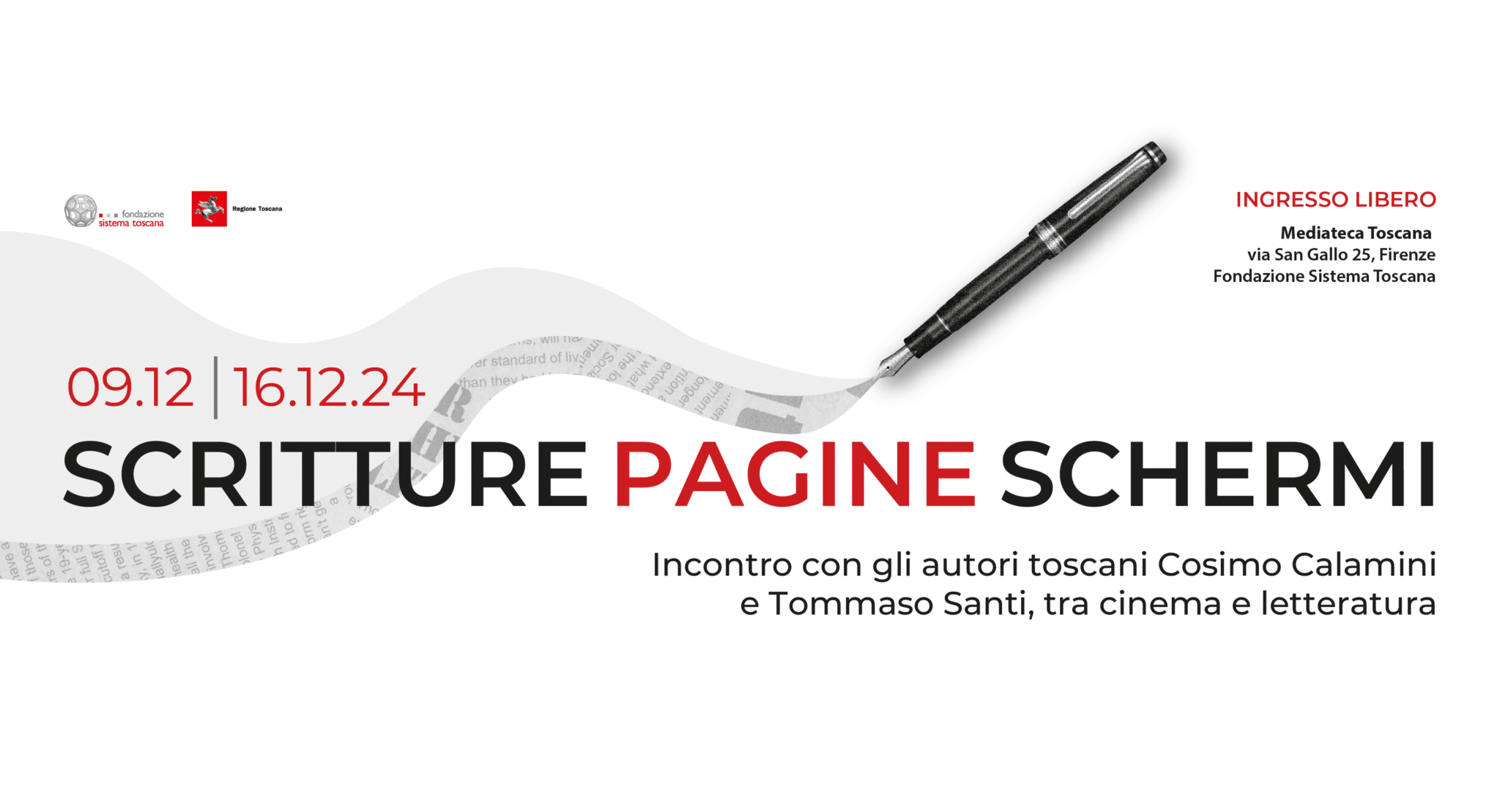 “Scritture Pagine Schermi” è in programma il 9 e il 16 dicembre, alle ore 17.00, presso la sede di Mediateca Toscana (in via San Gallo, 25 a Firenze): i due appuntamenti sono dedicati al lavoro creativo di due talenti toscani, scrittori di romanzi e di sceneggiature di film e documentari, Cosimo Calamini e Tommaso Santi.