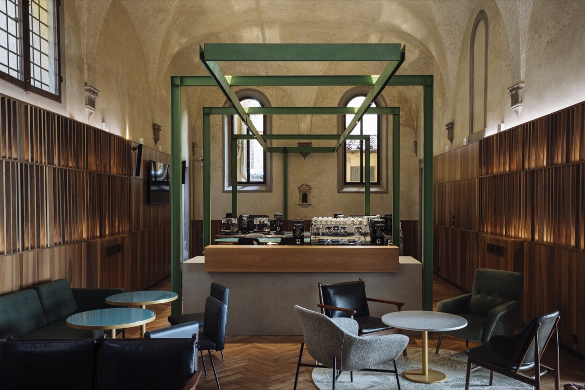 Toscanità e tradizione degli spazi si sposano con interni contemporanei dal carattere internazionale: è questo il focus dell’intervento di recupero dei 300 metri quadri, incluso refettorio e chiostro, a cura di Studio Q-bic, fondato dall’architetto Luca Baldini e dal designer Marco Baldini. In particolare, l’ex refettorio del convento, che si affaccia sul chiostro, è la sede della Scuola del Caffè, mentre i locali che si affacciano su via Carducci sono il cuore della caffetteria. Linee pulite, colori neutri percorsi dal verde che si riconnette simbolicamente al giardino interno, legno, ferro, ottone travi a vista sono le coordinate delle ristrutturazione, mentre le pareti “ripulite” dalle più recenti tinteggiature ritrovano l’identità originale.