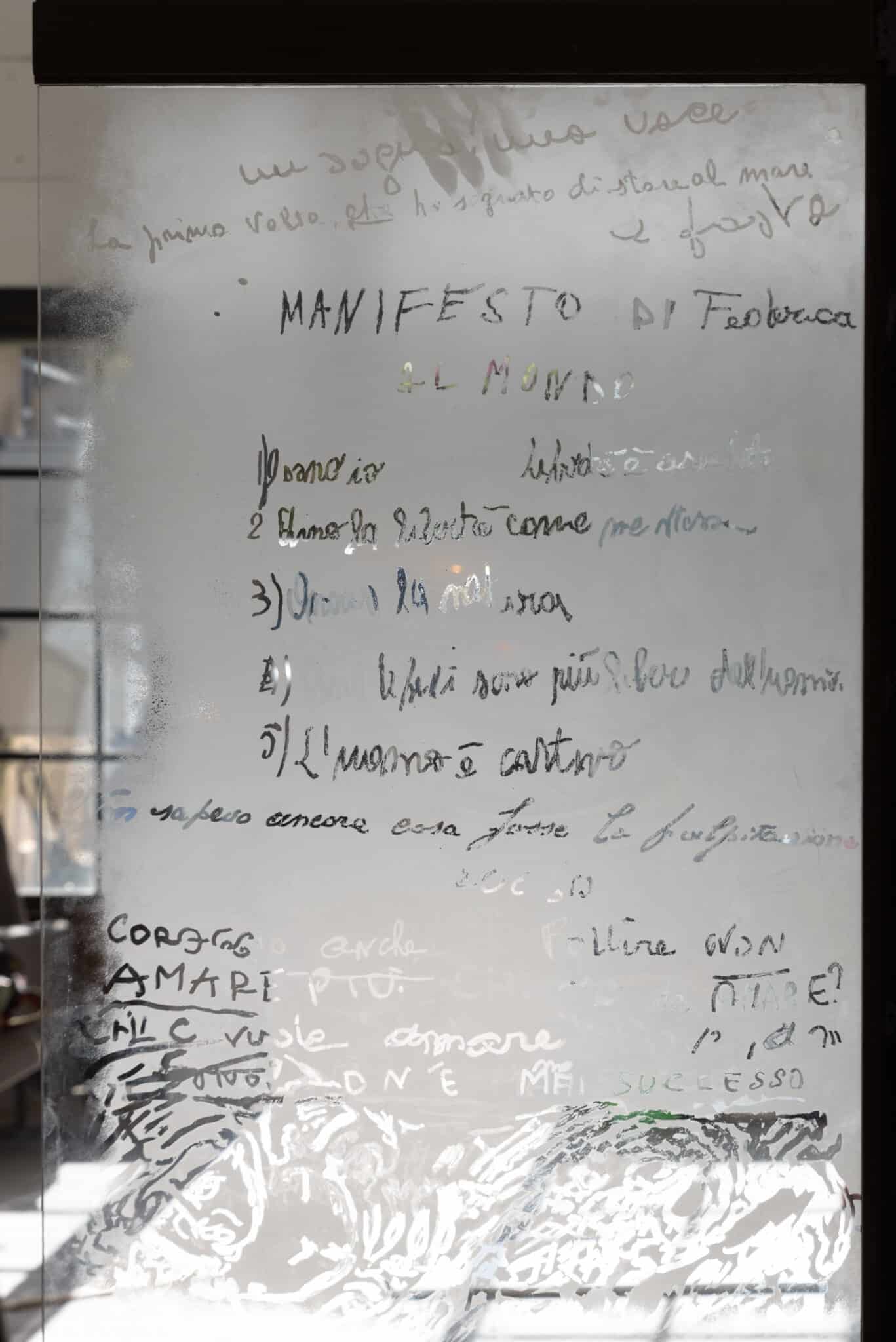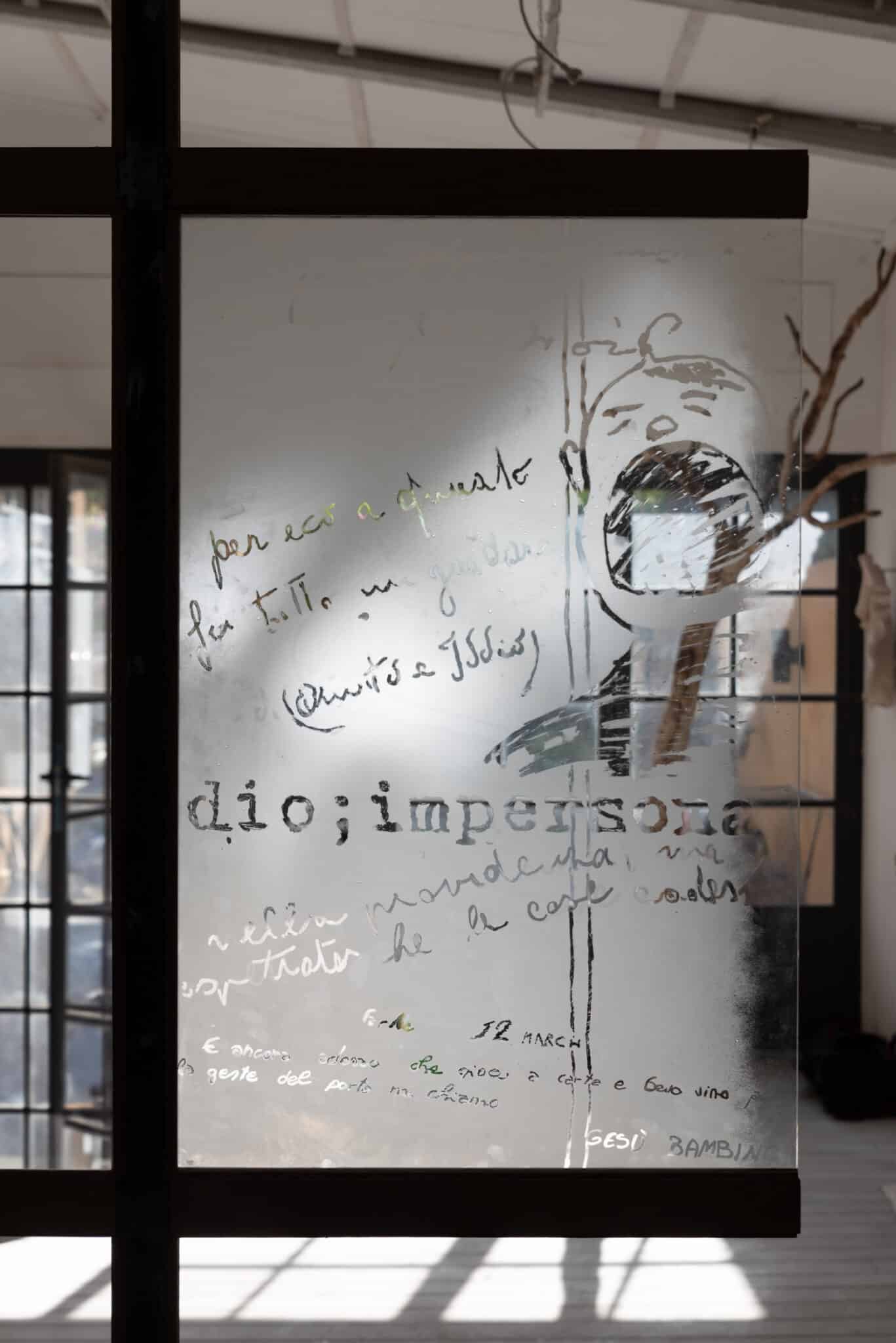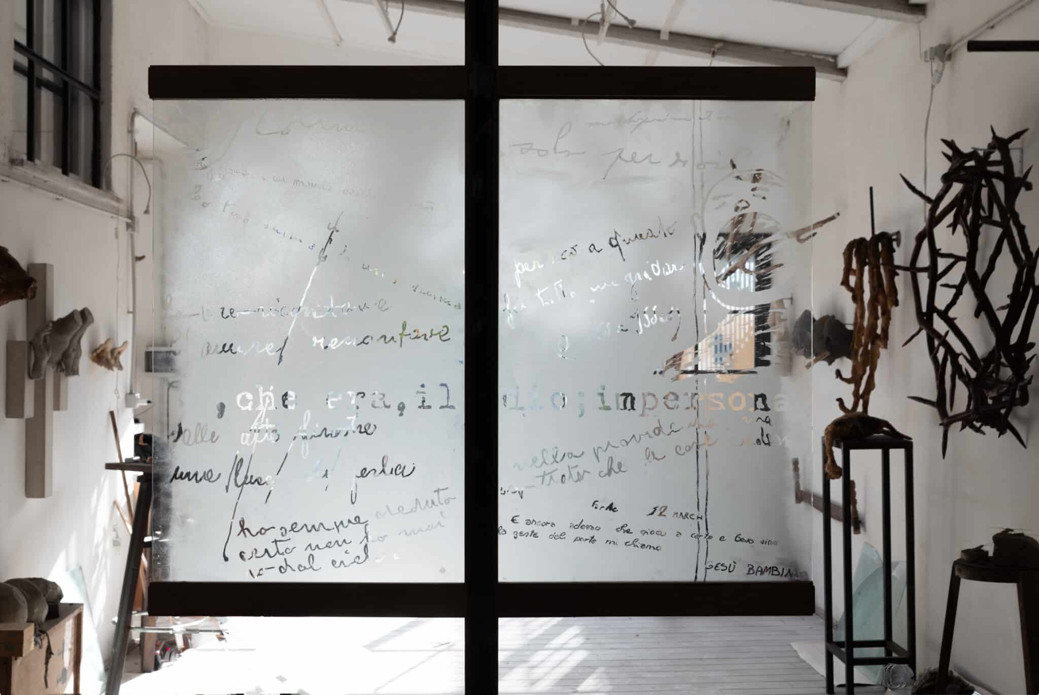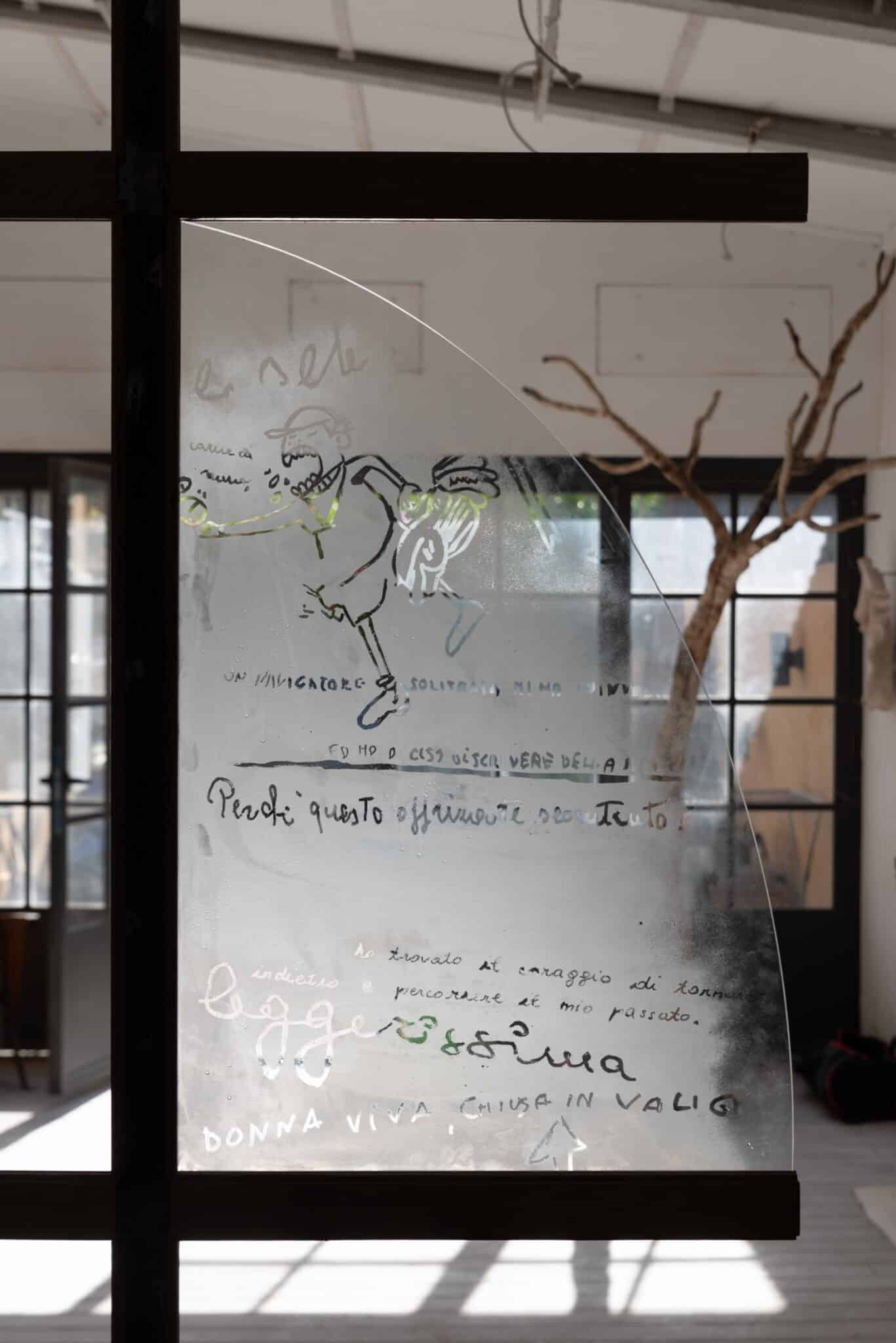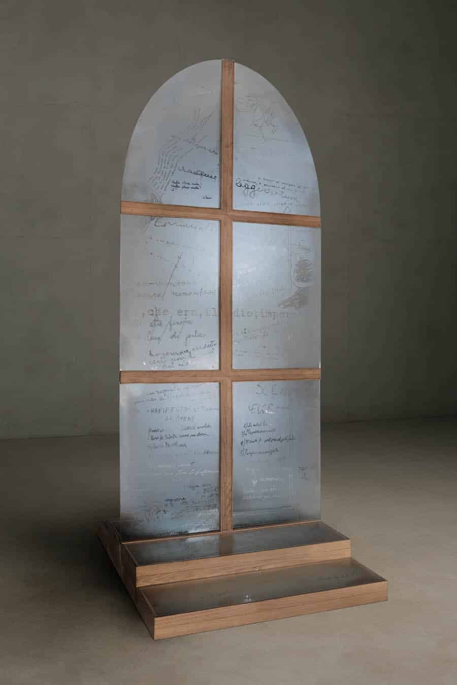 Queste parole andranno a imprimersi indelebilmente su una scultura che richiama una porta in vetro dell’altezza di tre metri, simbolo di apertura, ma anche confine valicabile e varco necessario per immedesimarsi in una posizione di ascolto e comprensione delle testimonianze delle persone comuni che hanno scelto di raccontare la propria vita.