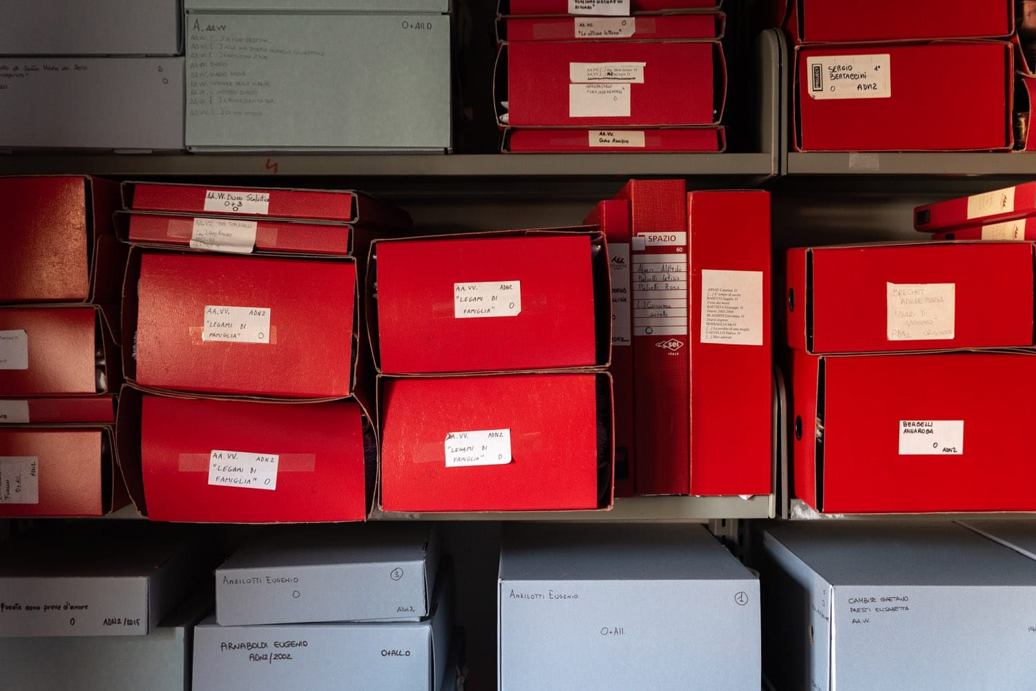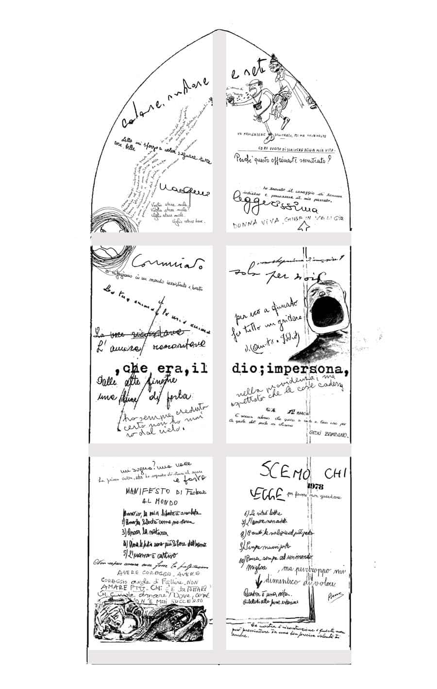 Nei grandi vetri dell’opera l’artista sviluppa un percorso narrativo, una mappa ideale dell’esperienza umana attraverso le testimonianze conservate, che si apre con le parole del fondatore dell’Archivio, Saverio Tutino, giornalista e visionario.