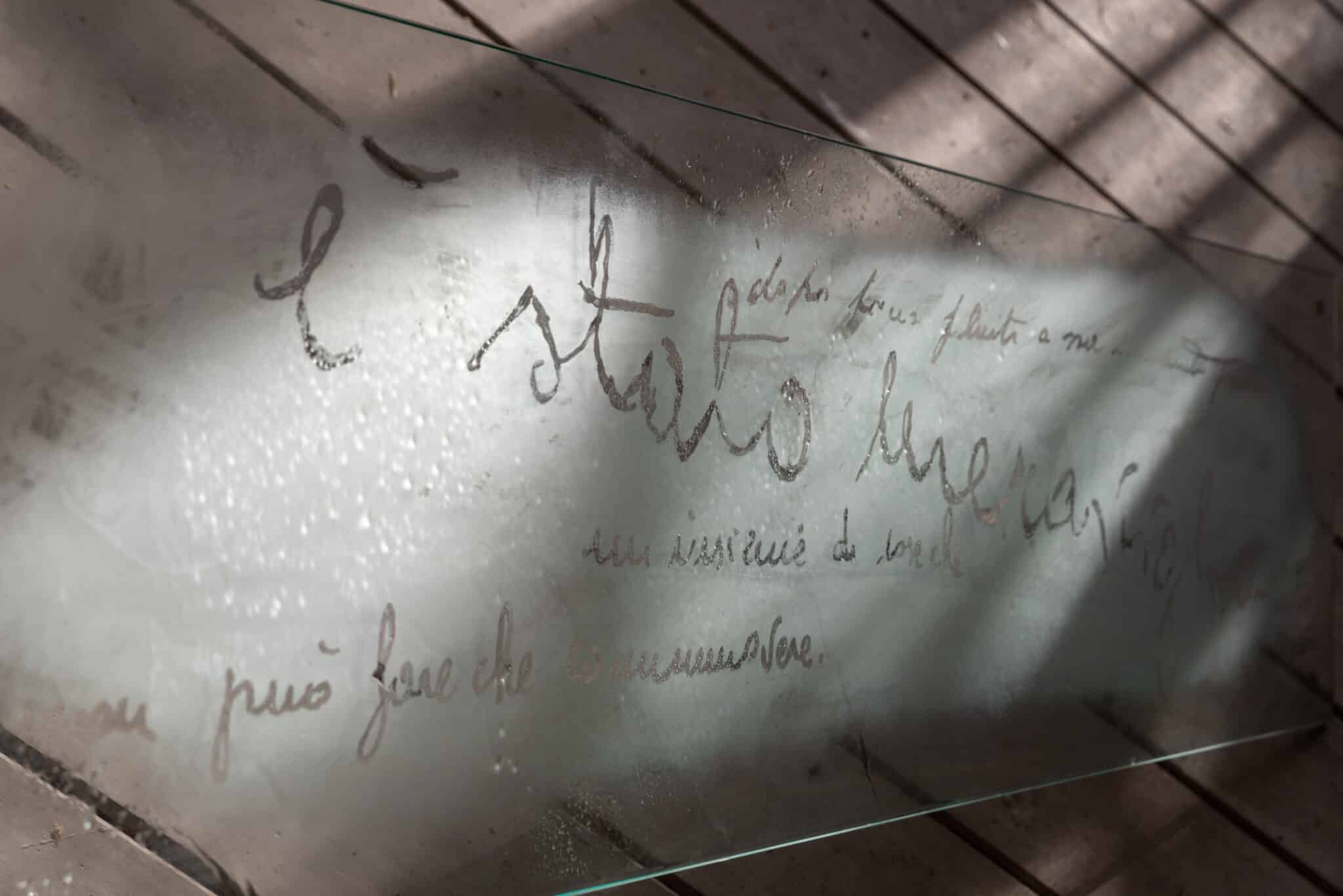 L’installazione fa parte dell’ultima produzione di Francesco Petrone, la serie “Respiro”, che verte sull’analisi simbolica del respiro come prima e ultima manifestazione della vita: l’artista “ferma” il respiro su vetro, come se esso fosse appannato, e su questo supporto riporta parole o frasi particolarmente significative e intime, con la grafia di chi ha lasciato tali testimonianze.