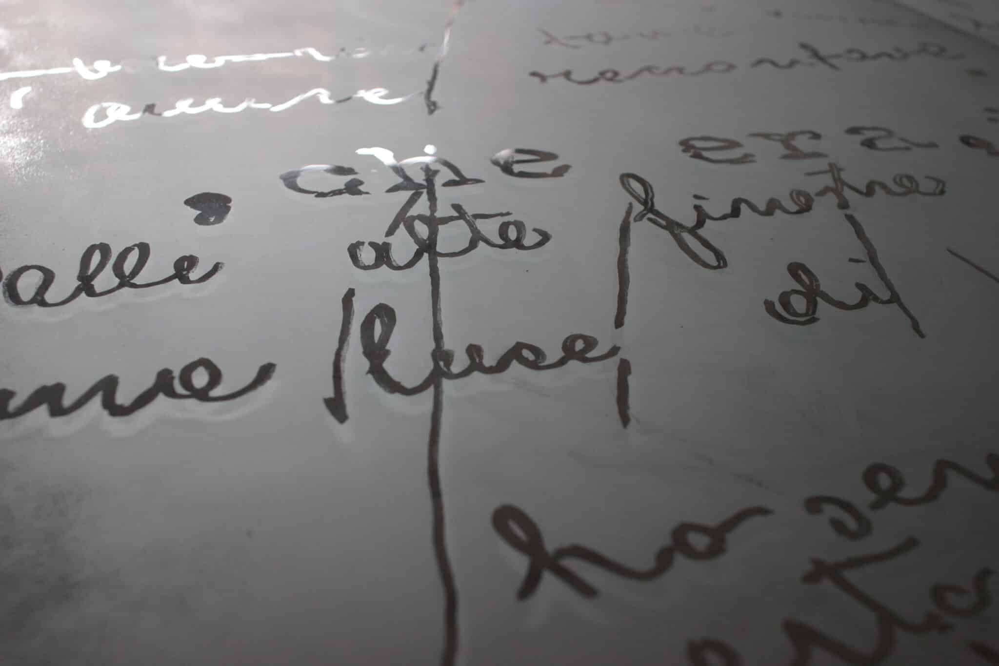 Frasi, disegni, annotazioni, un campionario di emozioni che per la loro normalità diventano straordinarie: un lavoro al cesello di costruzione e decostruzione, fatto a partire da una residenza in Archivio, attraverso la quale è stato possibile per l’artista entrare in empatia profonda con l’universo di voci.