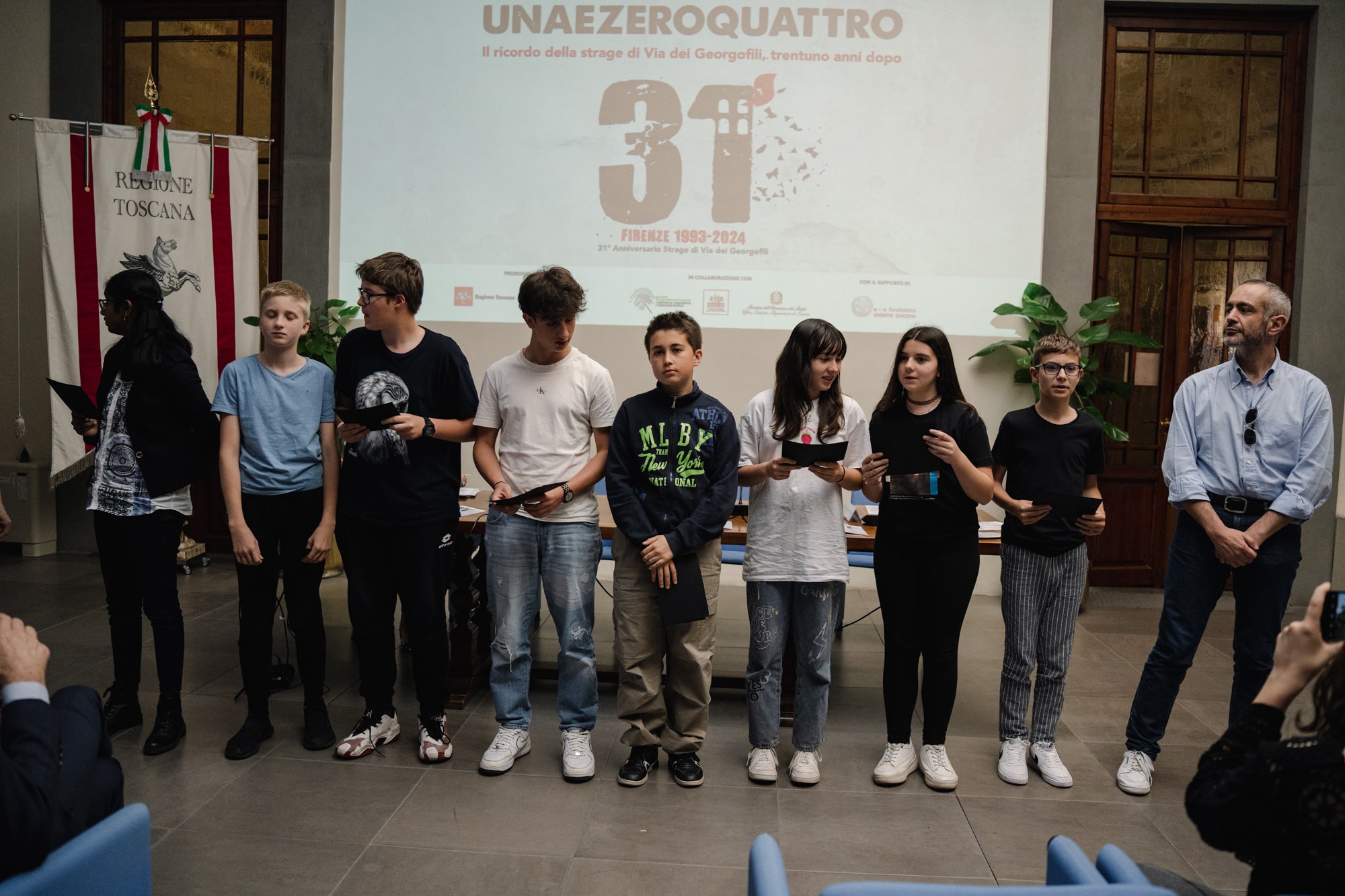 Alla fine la parola passa agli studenti. Più di duecento scuole hanno partecipato al progetto sulla cultura della legalità e la cittadinanza attiva promosso quest’anno dalla Regione. Sul palco, con un assaggio di quello che hanno fatto, salgono gli studenti dell’istituto comprensivo di Gallicano, in provincia di Lucca, con un pezzo di teatro di memoria in cui danno voce a chi, quella notte di trentuno anni fa, era nei paraggi di via dei Georgofili ed è sopravvissuto, magari rimasto ferito. Dopo di loro è la volta del liceo artistico di Porta Romana a Firenze, con un breve video documentario.