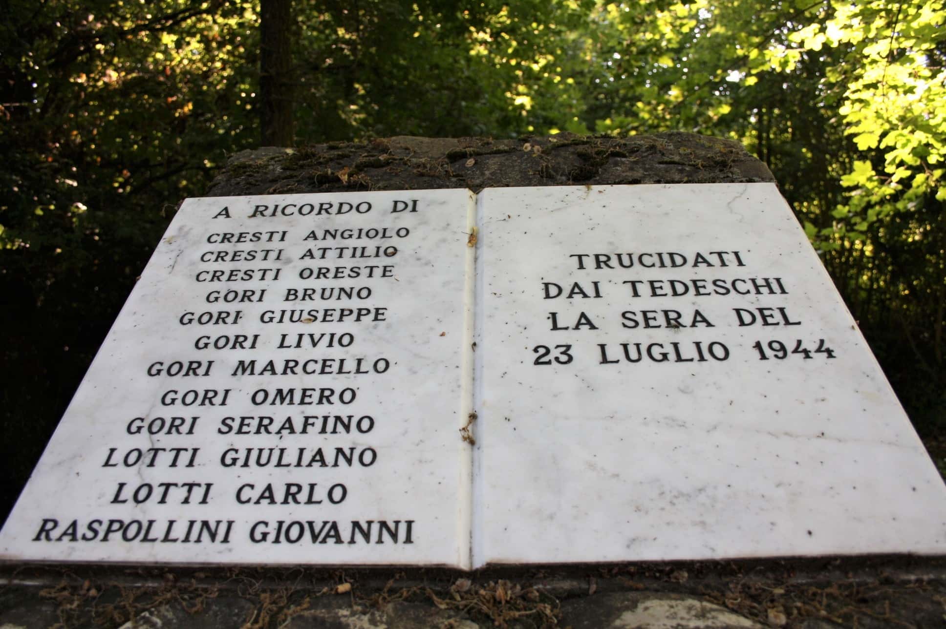 La vicenda ebbe luogo la sera del 23 luglio 1944 quando un gruppo di militari nazifascisti appartenenti alla 4^ Divisione Paracadutisti fece irruzione in alcuni casolari della zona e, separati gli uomini dalle donne e dai bambini, prelevò dodici contadini per condurli nell’attigua area boschiva, trucidandoli con raffiche di mitra quale atto di rappresaglia.