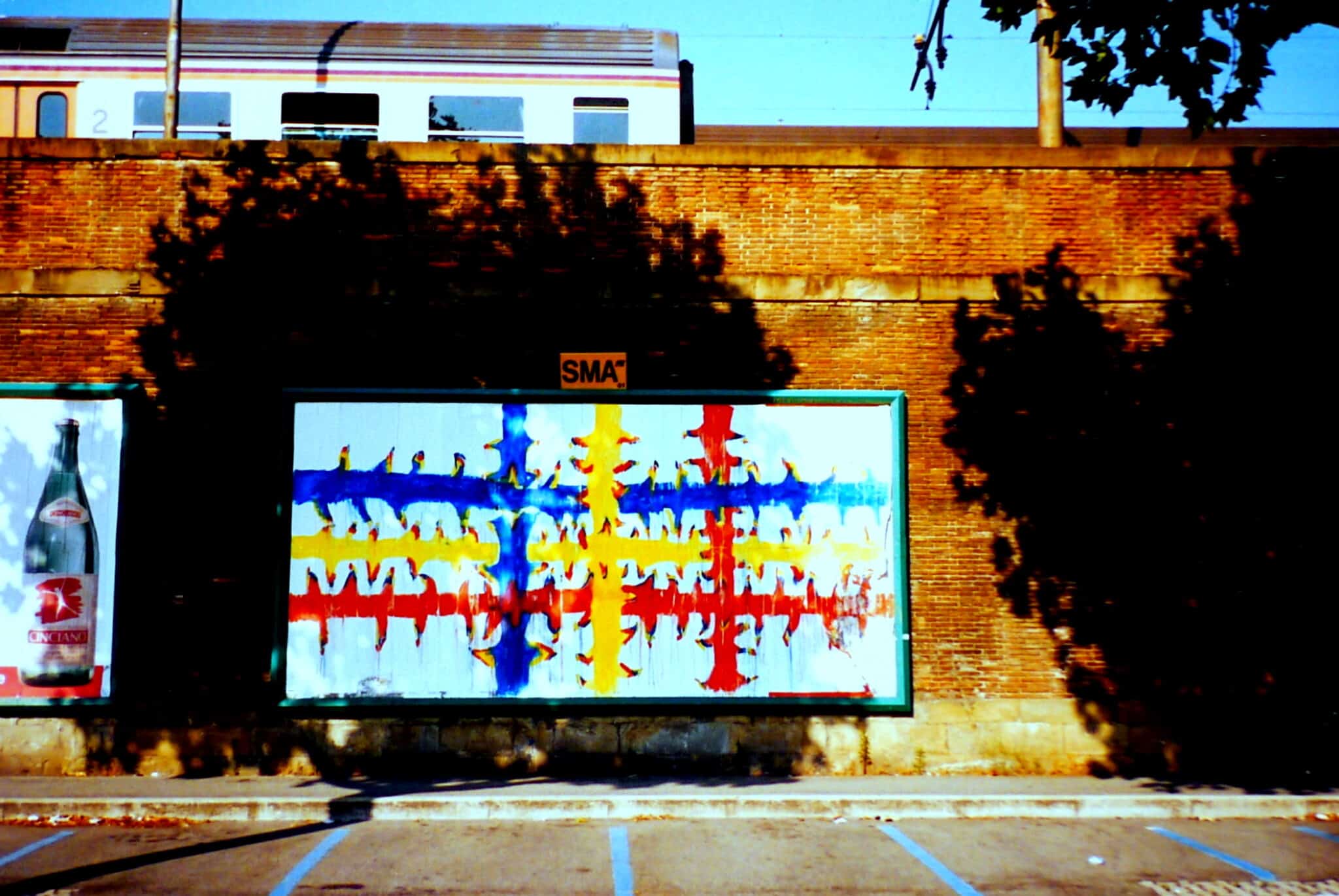 Lorenzo Pezzatini con il Filo creato nel 1977 costituisce il nucleo e la cellula generativa di tutto il suo lavoro: un oggetto filiforme e puntuto di colore acrilico blu, giallo e rosso, una vera e propria emanazione della pittura su tela, la forma ideale per alludere a una possibile trasformazione globale della realtà. Nato a Firenze nel 1944 si trasferisce nel 1974 negli Stati Uniti per ragioni di studio 1981 ottenendo un Master presso l’University of Massachussets – Amherst nel 1981. Negli anni ’80 ha vissuto a New York entrando in contatto con il graffitismo e a Roma dove dette inizio alla “Filografia Urbana” sui billboards 6X3, che in seguito avrebbe trasferito nelle strade di Firenze.