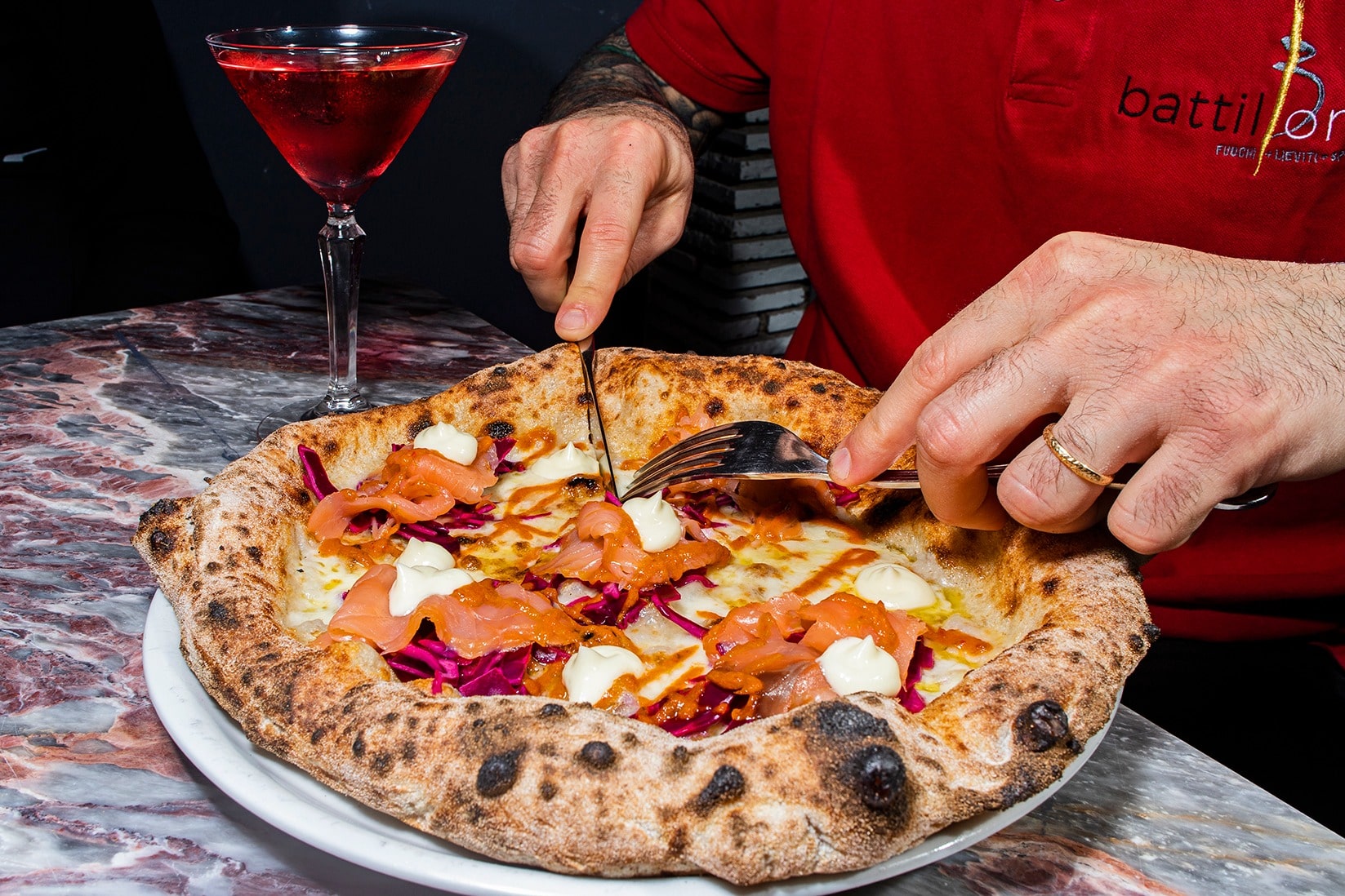 Nel locale, aperto nel febbraio 2018, realizza il suo sogno di una pizzeria in cui l’arte bianca si fonde con il mondo della miscelazione e degli spiriti. Fondamentale l’attenzione a lieviti e impasti e alle materie prime  delle pizze di Battiloro.