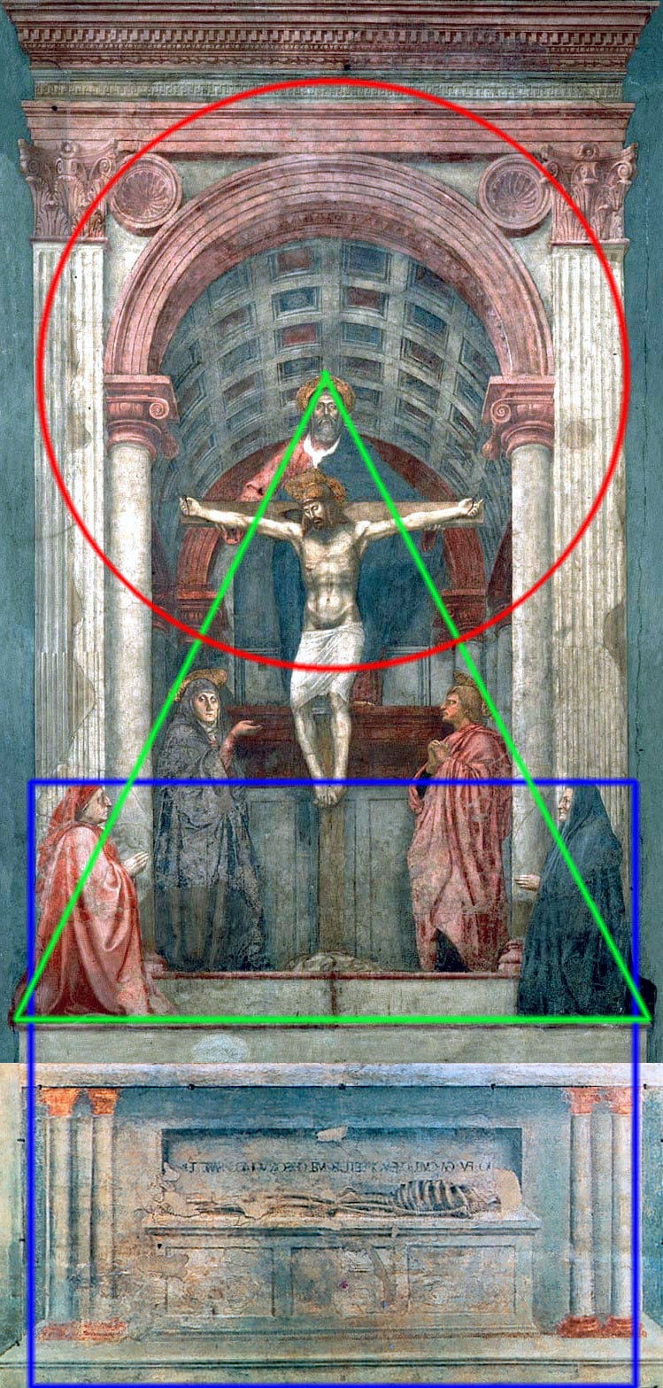 La Trinità è considerata rivoluzionaria perché, per la prima volta nella pittura occidentale, la prospettiva non è solo “intuita”, ma costruita in modo matematico e perfettamente coerente.