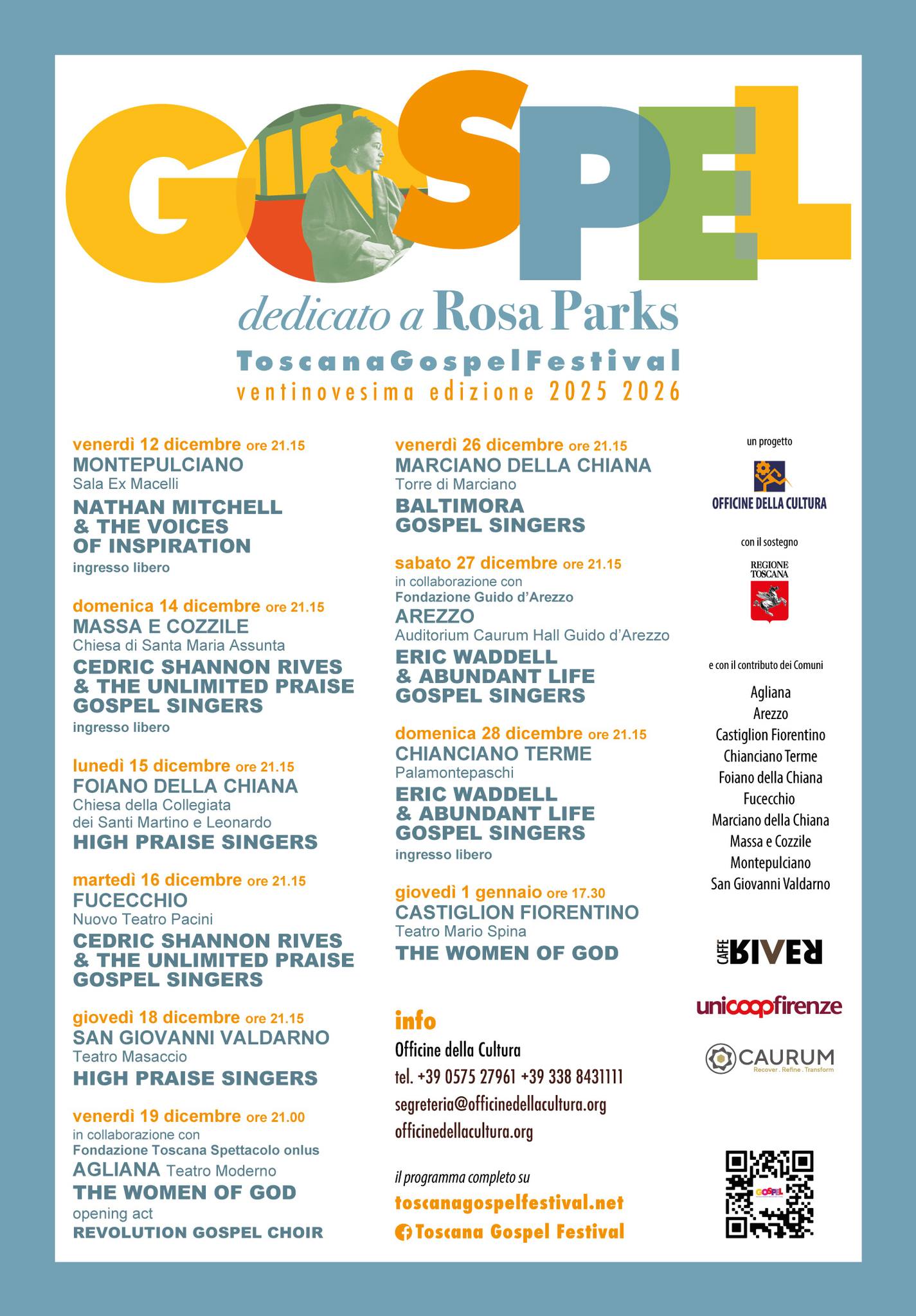 I direttori artistici Andrea Laurenzi e Luca Baldini hanno dichiarato: “ ‘Non devi mai temere ciò che stai facendo quando sai che è giusto farlo’ con queste parole, Rosa Parks ci ricorda che la libertà nasce dal coraggio. Coraggio di alzarsi, di dire no, di credere che ogni gesto possa cambiare il mondo. Questa XXIX edizione del Toscana Gospel Festival è dedicata a lei, nel settantesimo anniversario di quel piccolo/grande gesto di non cedere ai soprusi, simbolo universale di dignità e resistenza, e alla forza contagiosa che il gospel ha saputo portare nel suo tempo e nel nostro.Da ventinove anni questo festival cammina, resiste e si rinnova. Nessuna strada è stata semplice, nessun traguardo scontato. Ma la musica gospel — con la sua miscela di spiritualità, storia, lotta e speranza — ha sempre mostrato la direzione: andare avanti, anche quando sembra difficile, perché ciò che si sta facendo è giusto. In quasi tre decenni, il Toscana Gospel Festival non è stato soltanto un appuntamento musicale, centinaia di cori, migliaia di cantanti, decine di città, teatri, chiese, piazze della nostra Toscana hanno risuonato della dolce e profonda musica gospel. Il festival è diventato un ponte culturale tra Italia e Stati Uniti, un rito collettivo fatto di coralità, anima, comunità. Ha attraversato crisi economiche, pandemie, incertezze e trasformazioni, ma ogni volta è tornato più forte, sorretto dall’entusiasmo del pubblico, dalla passione delle città che lo ospitano e dal sostegno prezioso di tutti i Comuni e della Regione Toscana, insieme a numerosi partner e sostenitori privati che credono nel valore profondo di questo progetto. Officine della Cultura porta avanti questa avventura con la convinzione che il gospel non sia solo musica, ma memoria, libertà e futuro. Ogni concerto è una celebrazione e un invito a partecipare, a sentirsi parte di qualcosa che unisce, riscalda e libera. Questa edizione non è solo un cartellone, è un atto di gratitudine e continuità. Celebriamo la musica, celebriamo la comunità, celebriamo la libertà. E, come Rosa Parks, continuiamo a credere che la cosa giusta valga sempre il cammino.”