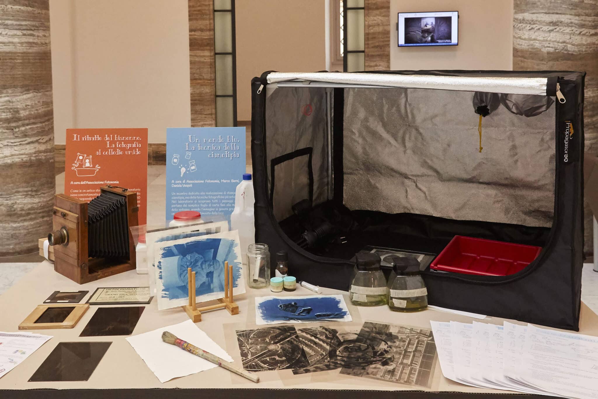 Dimostrazione delle fasi della fotografia ottocentesca, dalla ripresa allo sviluppo.