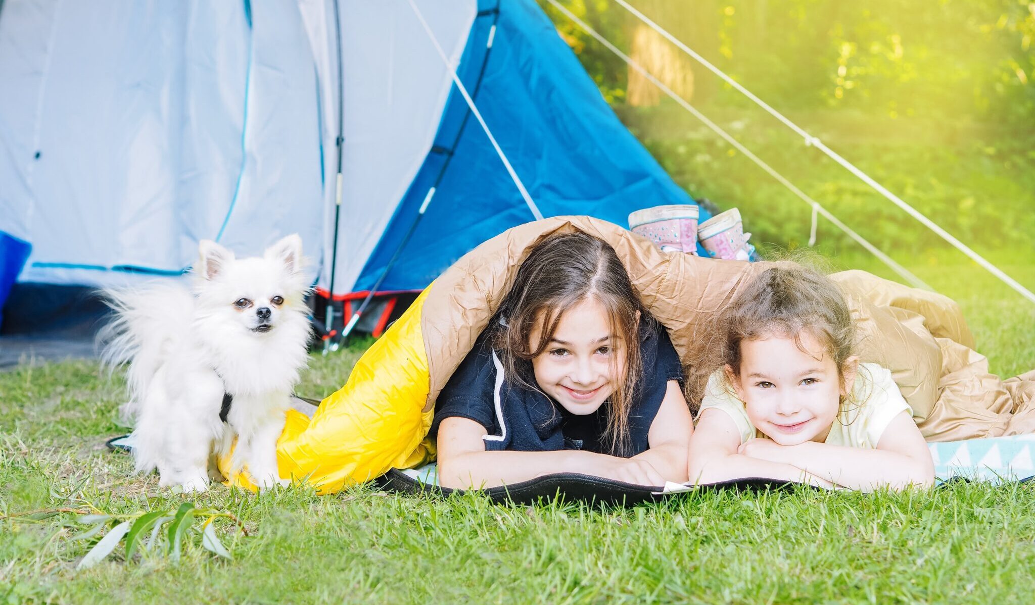Camp in the tent – girls with little dog chihuahua sitting together near the tent. Camping with children. - © AdobeStock