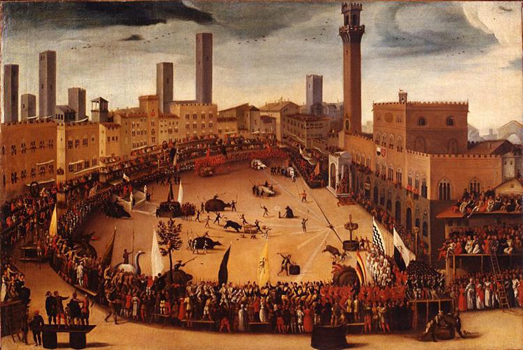 Sono opere di proprietà degli Uffizi profondamente legate all’identità di Siena, vedute di Piazza del Campo realizzate nel 1585 intitolate ‘Piazza del Campo con la sfilata delle contrade’ e ‘Piazza del Campo con la caccia ai tori’.