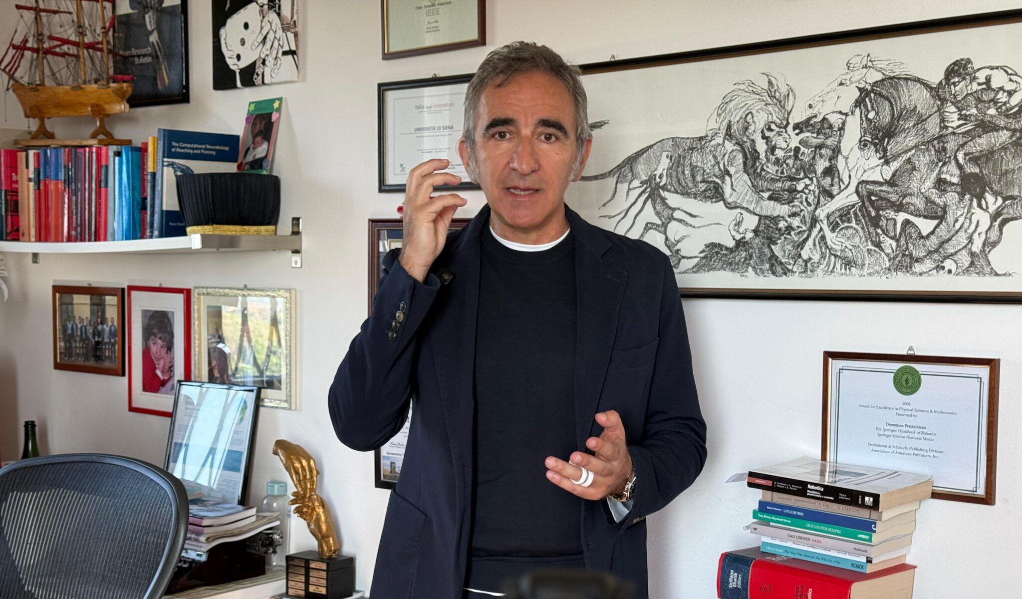 Il dispositivo è un anello intelligente che consente di attivare e ricevere risposte da sistemi di intelligenza artificiale, come Claude o ChatGPT, in tempo reale e in modo discreto. Un’interfaccia minima e quasi invisibile che cambia però radicalmente il rapporto tra uomo e tecnologia. “L’anello – precisa il professor Prattichizzo – permette di integrare al meglio l’intelligenza artificiale con l’intelligenza naturale dell’essere umano con un’interfaccia sensorimotoria”.