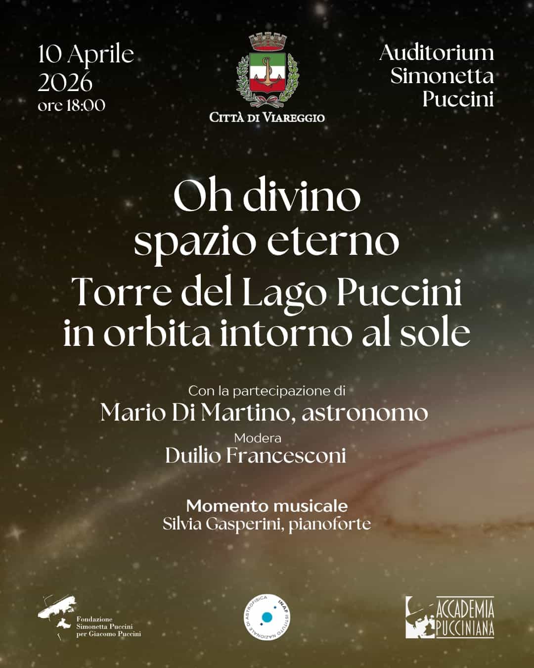 L’evento sarà celebrato anche dall’iniziativa Oh divino spazio eterno – Torre del Lago Puccini in orbita intorno al Sole”, in programma il 10 aprile alle 18:00 all’Auditorium Simonetta Puccini.
