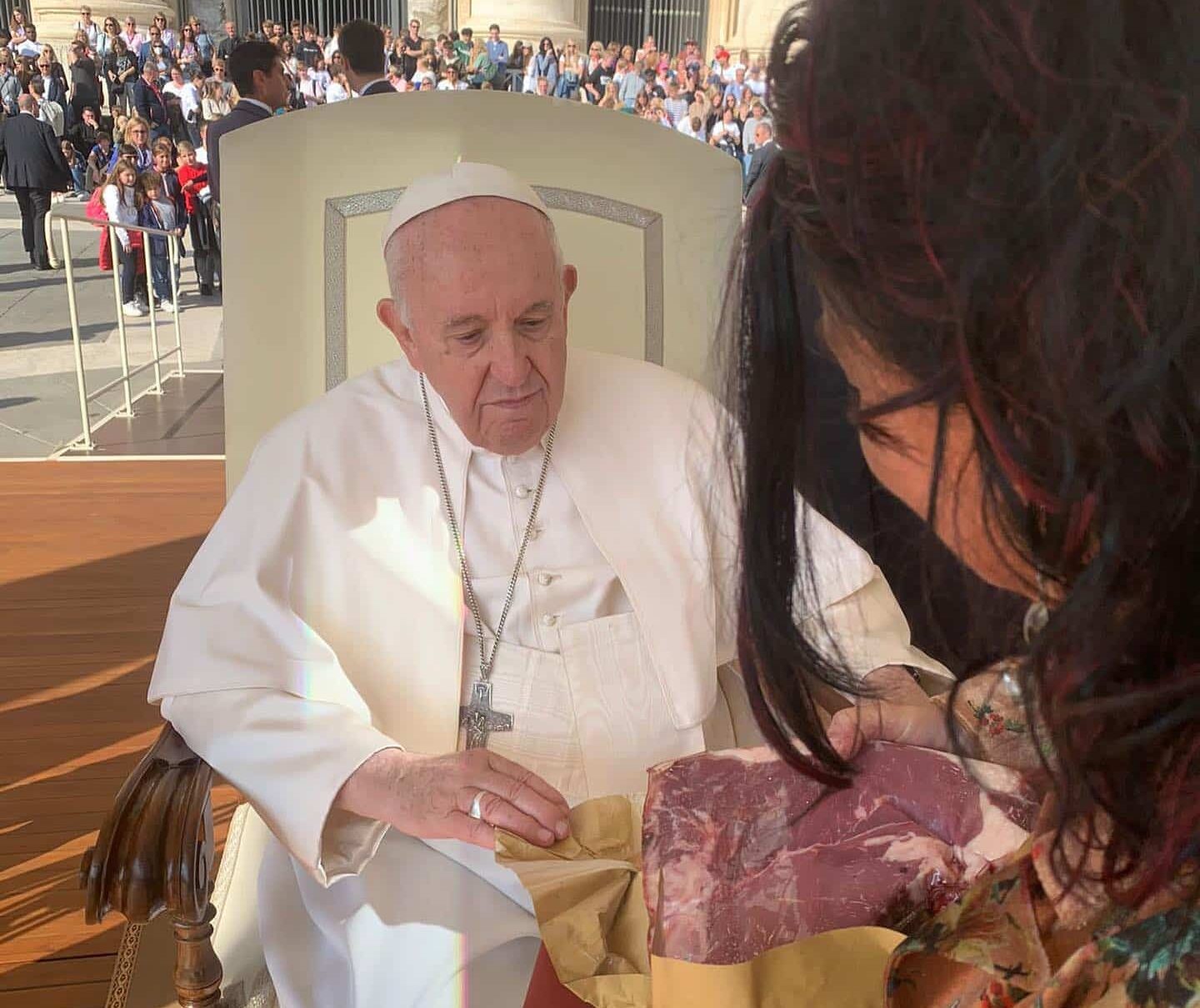 Arriva a San Pietro il mercoledì, proprio in occasione della tradizionale udienza del pontefice. Si presenta davanti a un sorpreso papa Francesco con tre chili di Fiorentina. Il santo padre, austero nella vita come a tavola, appare sorpreso dall’enorme bistecca.