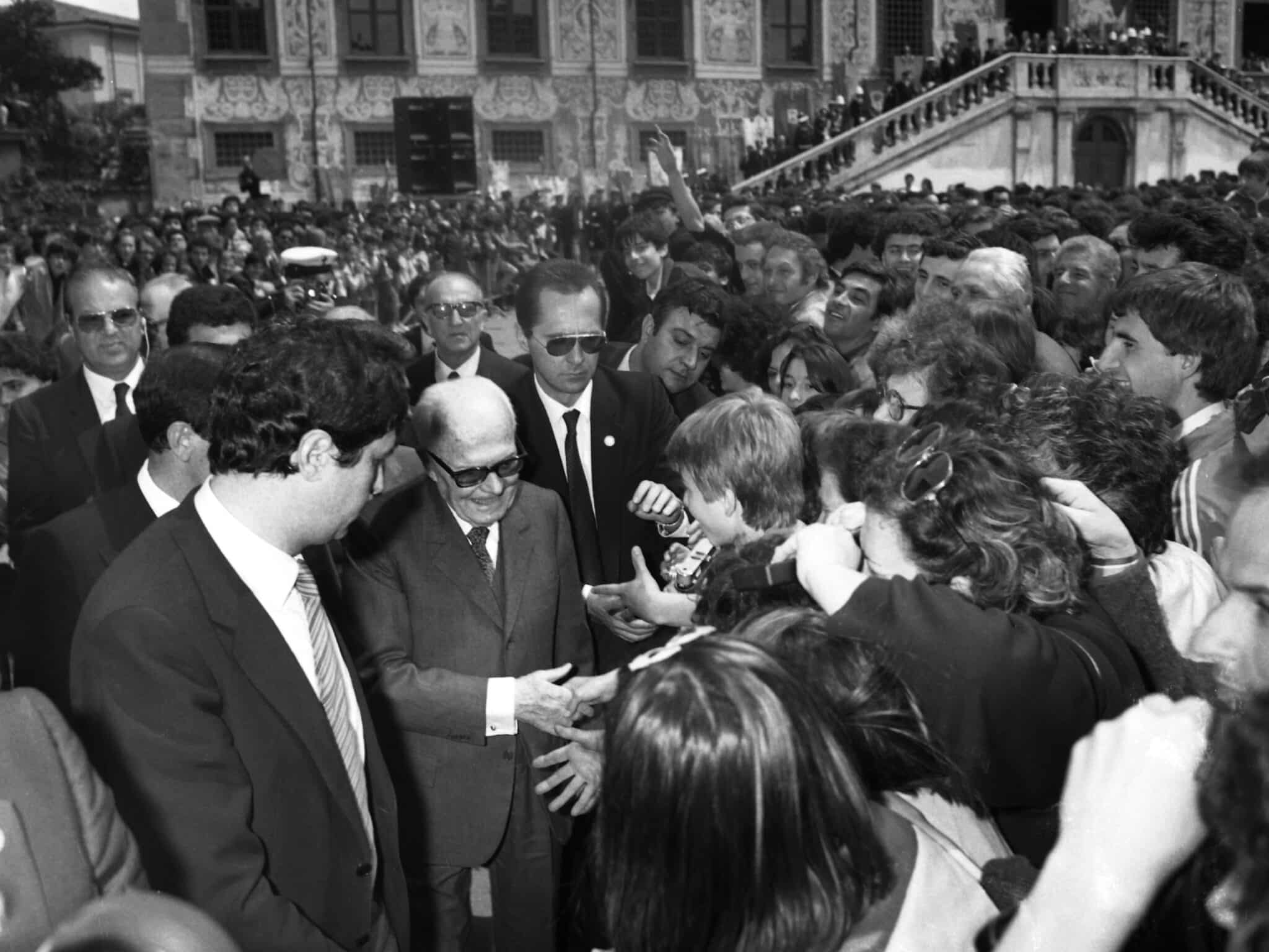 Il Presidente della Repubblica Sandro Pertini (1896-1990) visita le sedi universitarie pisane nel 1984. L’incontro in Piazza dei Cavalieri, di fronte alla Scuola Normale – Archivio Frassi, Fondazione Pisa