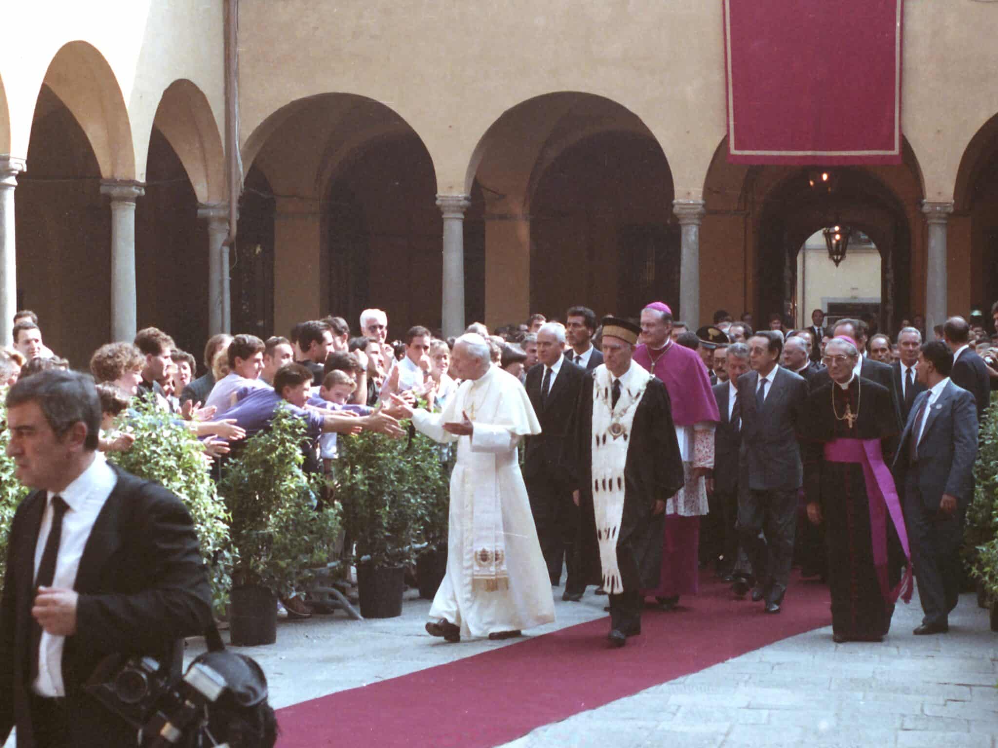 In visita a Pisa nel settembre del 1989, papa Giovanni Paolo II (1920-2005) visitò anche le sedi universitarie. Qui è ritratto nel cortile del Palazzo della Sapienza in compagnia, tra gli altri, dell’allora rettore, lo studioso di ingegneria nucleare Bruno Guerrini (1930-2011) – Archivio Frassi, Fondazione Pisa
