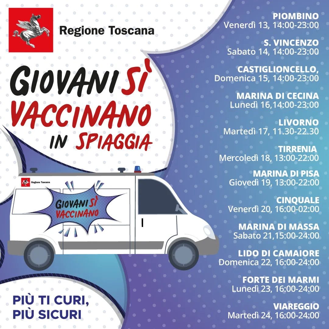 Il camper dei vaccini anti-Covid prosegue il suo tour sulla costa toscana e dal 13 agosto sarà in Versilia e nell’aria di competenza della Asl nord ovest. L’iniziativa del progetto “GiovaniSìVaccinano in spiaggia” si arricchisce così di altre 12 nuove tappe fino a martedì 24 agosto, partendo da Piombino fino a Marina di Massa.