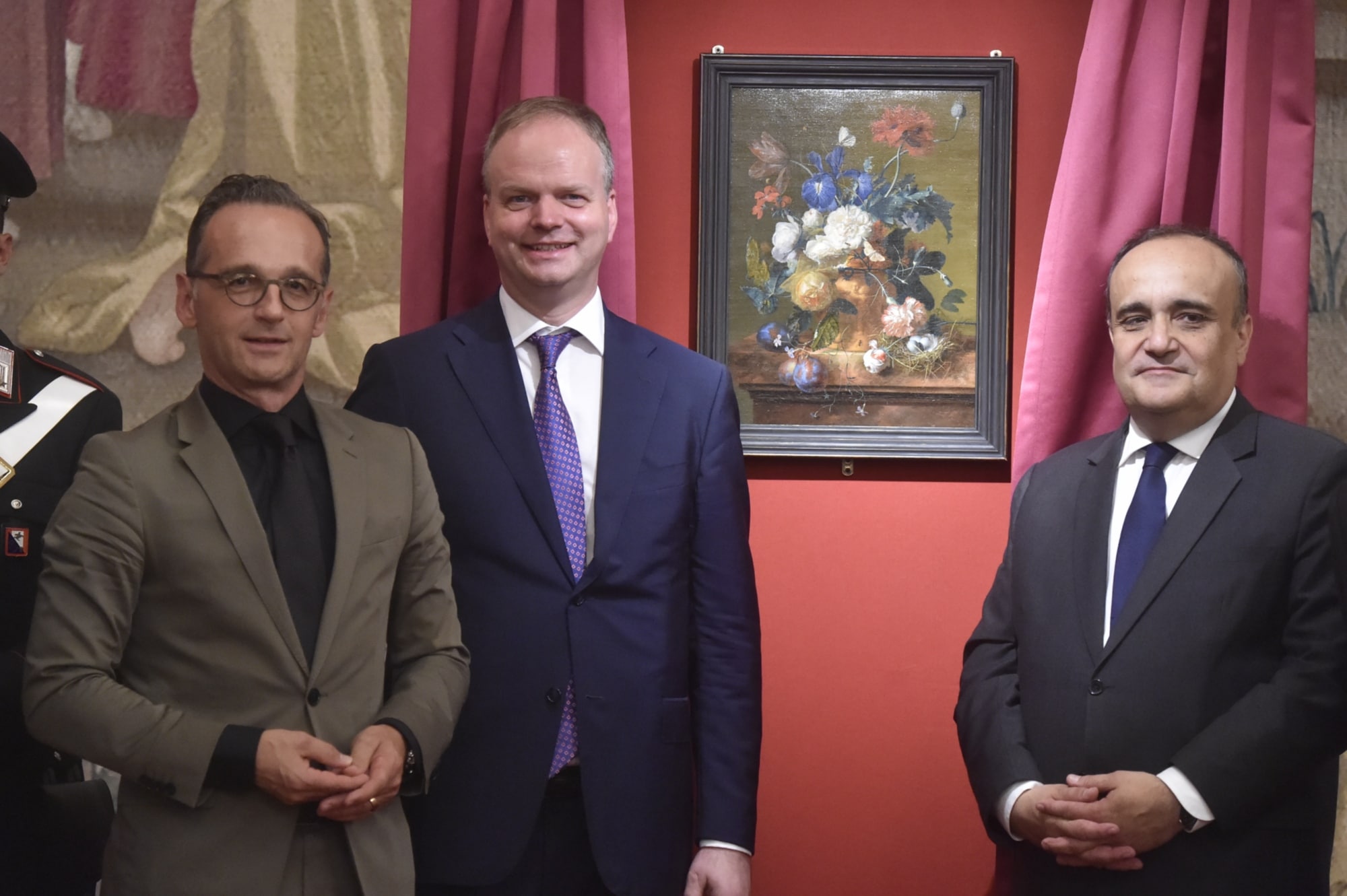 Il Vaso di Fiori, opera del pittore olandese Jan van Huysum rubata nel 1944 durante la ritirata delle forze di occupazione tedesche, è tornato a Palazzo Pitti a Firenze, nel luogo esatto in cui il dipinto si trovava 75 anni fa. A consegnarlo all’Italia è stato il ministro degli Esteri tedesco Heiko Maas nel corso della cerimonia di restituzione che si è svolta ieri nella Sala bianca di Palazzo Pitti.