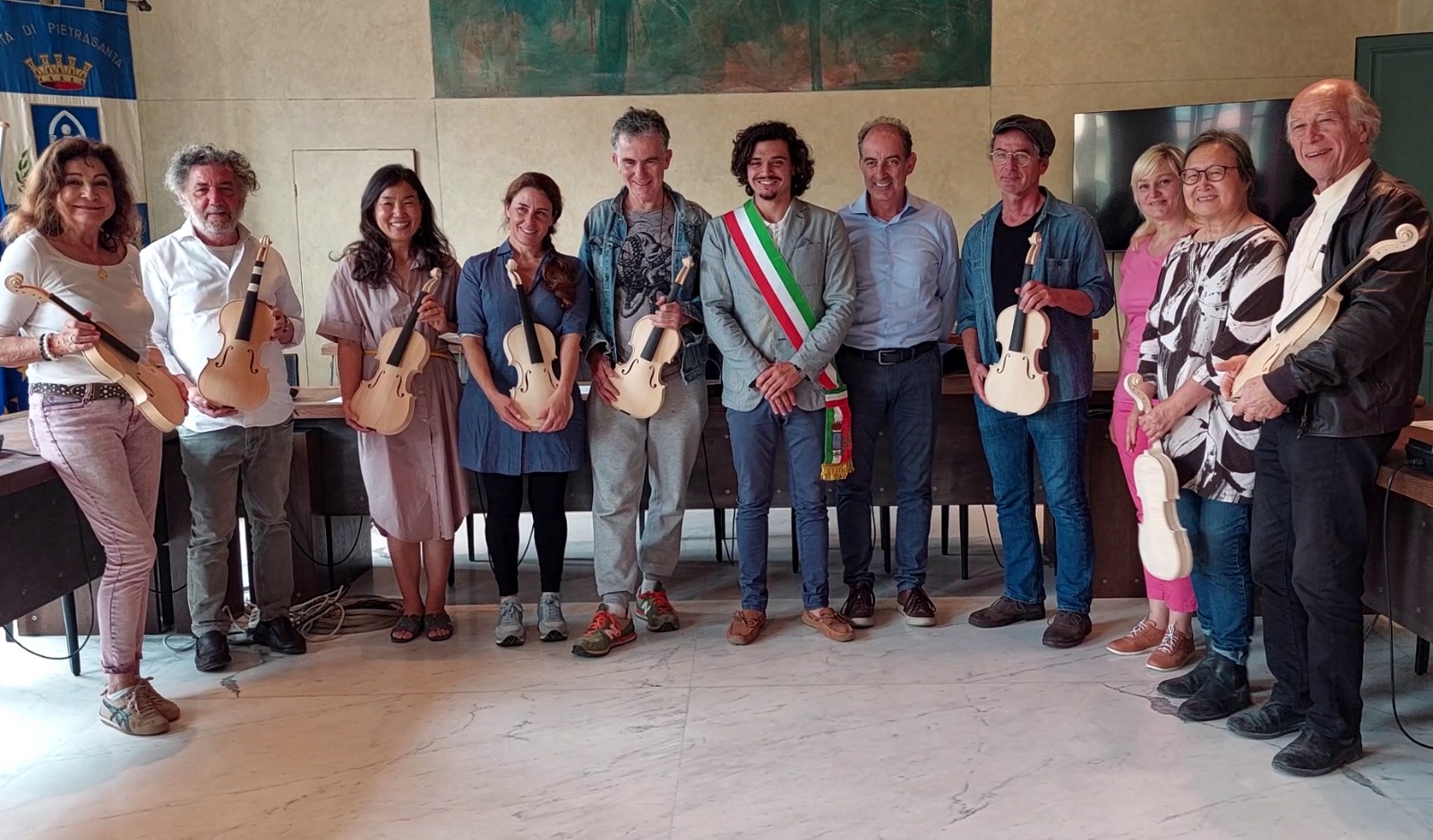 Sono stati consegnati martedì 24 maggio presso il Municipio di Pietrasanta 13 violini in legno ad altrettanti artisti di levatura internazionale legati alla città di Pietrasanta che avranno il compito di interpretarli artisticamente ciascuno a modo suo, restituendo così strumenti unici, destinati in seguito alla vendita ed i cui proventi saranno destinati ad aiutare la popolazione ucraina.