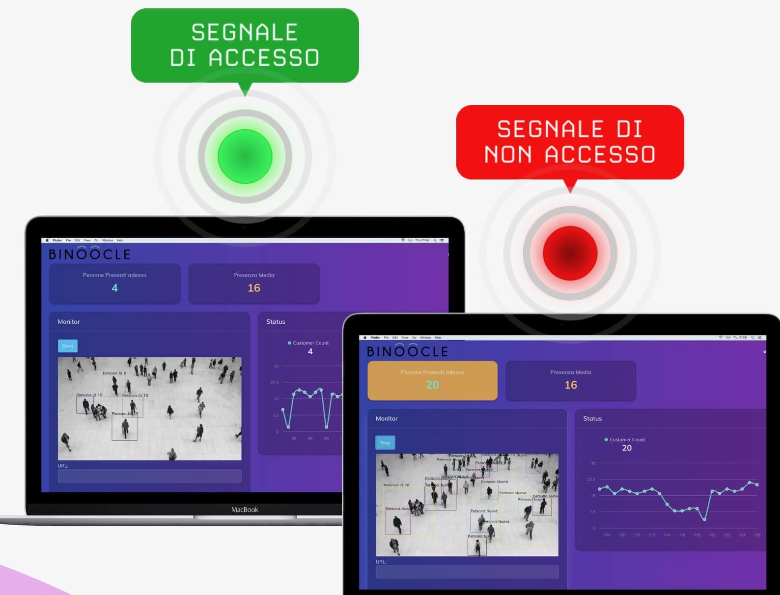 Il sistema lavora attraverso tre applicazioni diverse. La prima, Pro Person, è dedicata alla gestione del numero delle persone all’interno di un luogo: la webcam inquadra il numero dei presenti in un ambiente e se è superiore a quello indicato dalle normative di sicurezza emette un segnale acustico di allarme.