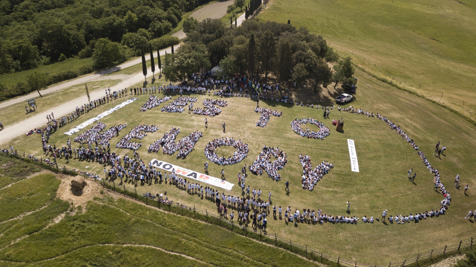 “Yes to Memory”. É la grande, enorme, scritta apparsa sulle colline di Monteroni d’Arbia, a Suvignano. Una tenuta che è un luogo simbolo, sequestrata dalla mafia dal giudice Giovanni Falcone nel 1983, nel giorno che segna il trentennale della strage di Capaci. Oltre 1500 studenti dalle scuole di tutta la Toscana sono arrivati qui per lanciare un messaggio ed essere parte di questa grande manifesto umano.